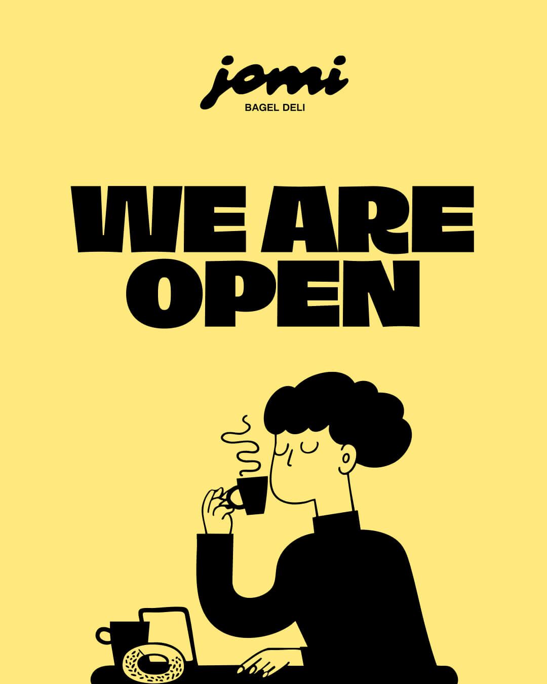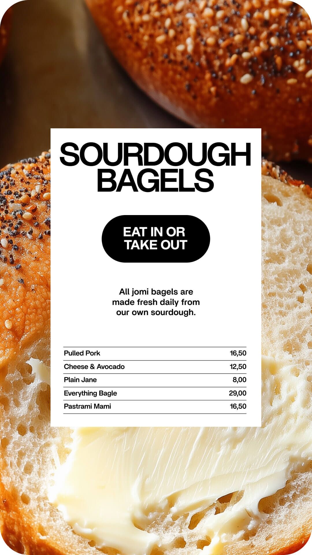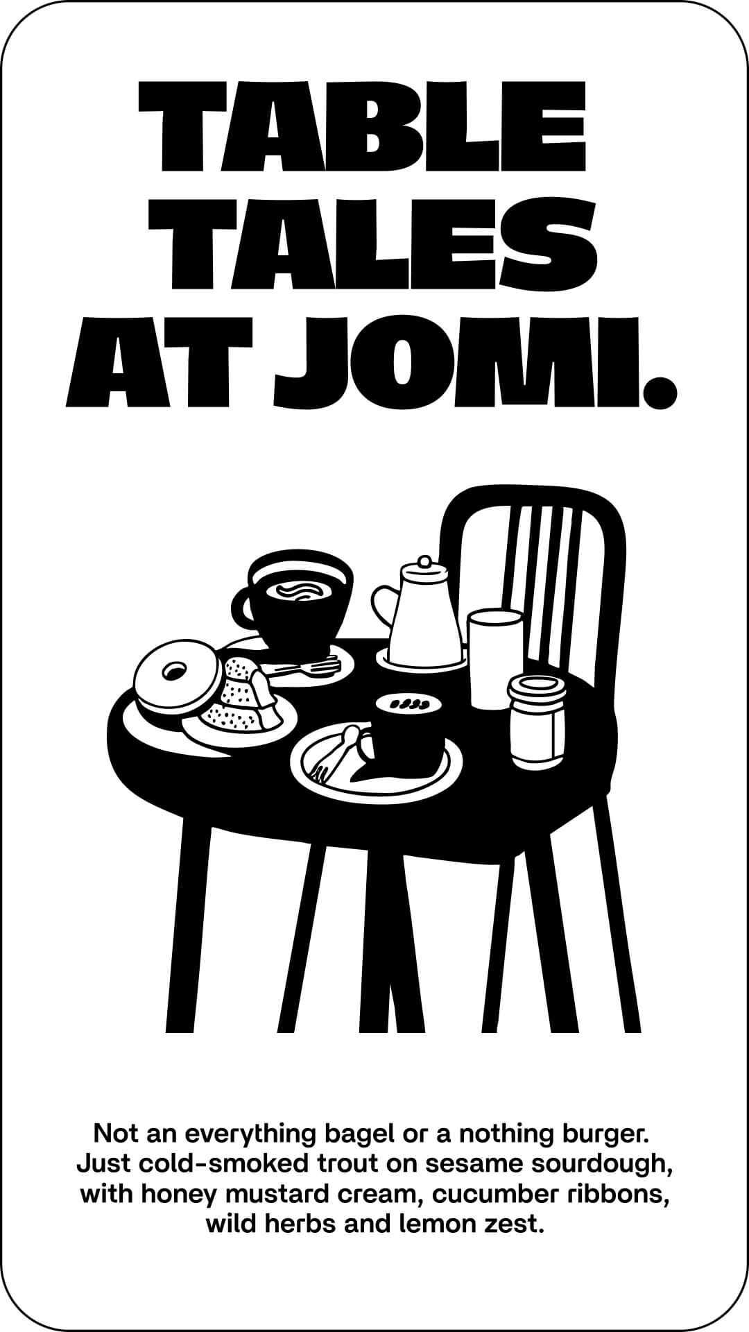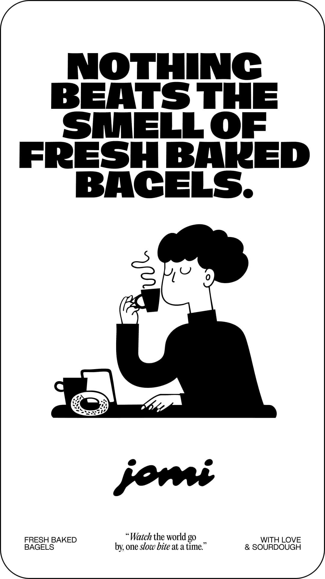 Illustrationen und KI-generierte Bildwelten erweitern die Tonalität und setzen Akzente, ohne den Fokus vom Produkt zu nehmen. Sie machen den Raum zwischen Bagel und Gast erlebbar, ein Raum, der nicht laut sein will, sondern ehrlich. In Social Media, auf Verpackungen, im Menü oder auf dem Fensterglas wird diese Sprache konsequent weitergetragen. Jomi bleibt dabei in jedem Format erkennbar, ohne sich zu wiederholen. Die Gestaltung kann flüstern oder erzählen, je nach Kontext.