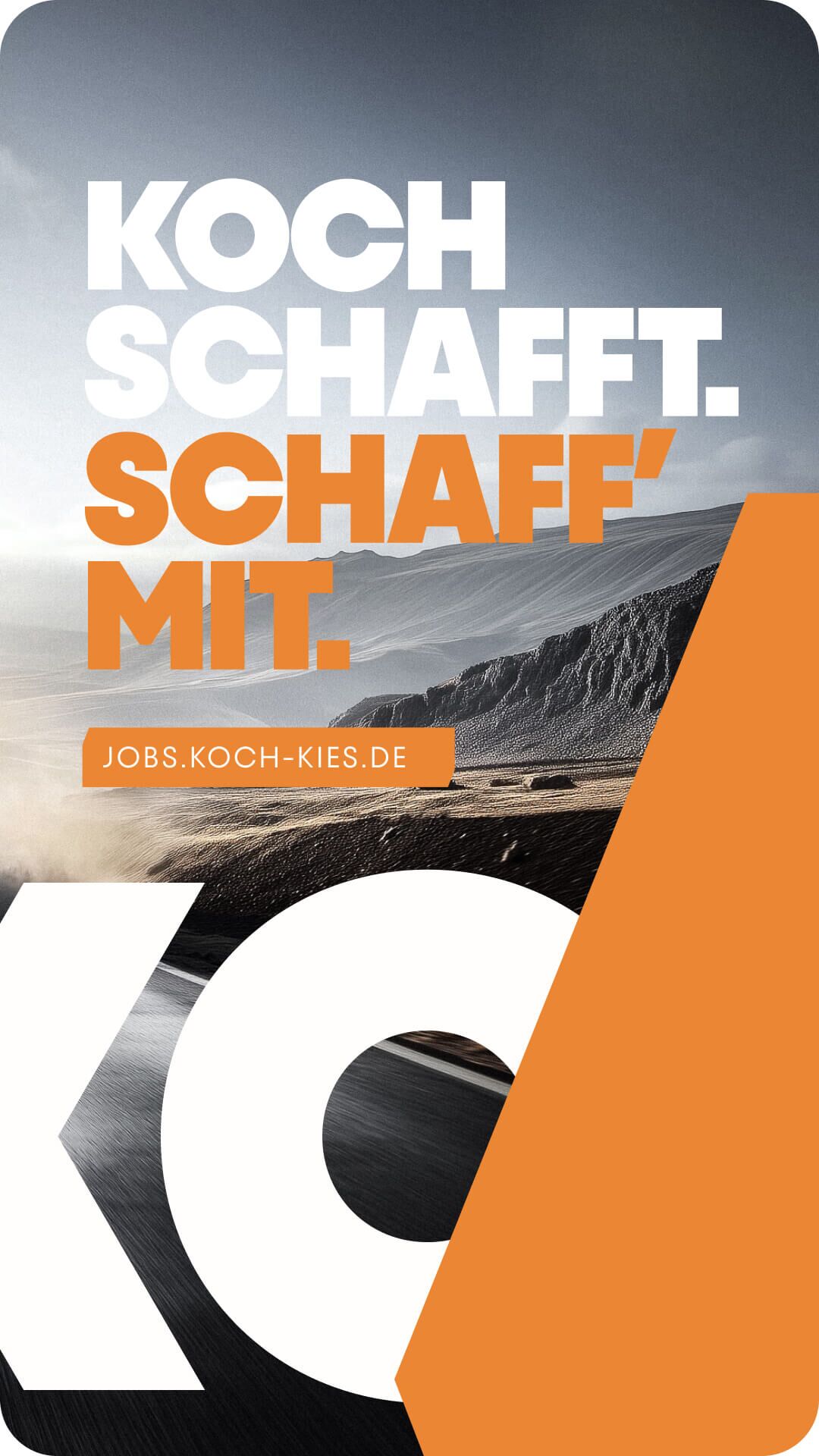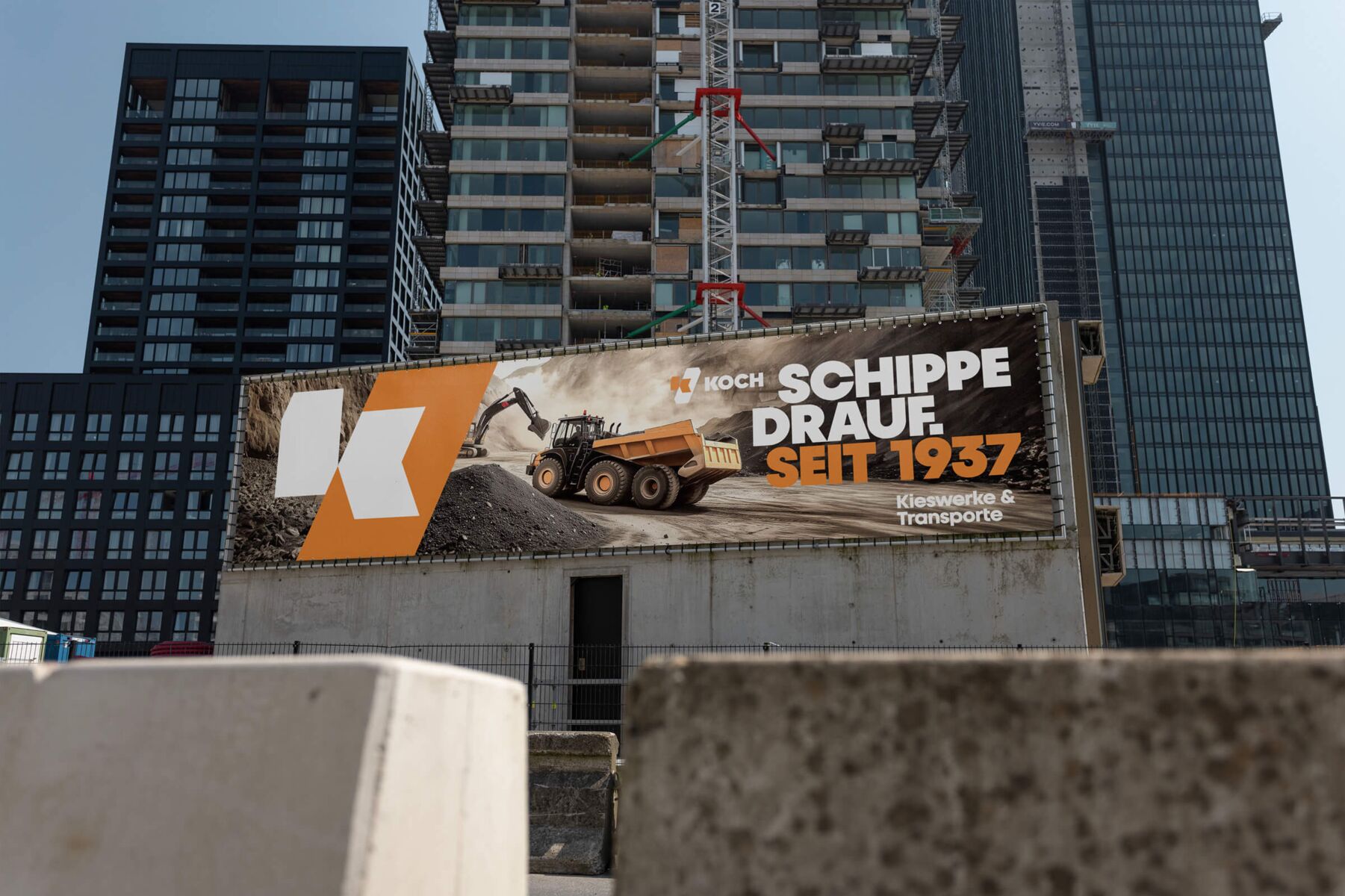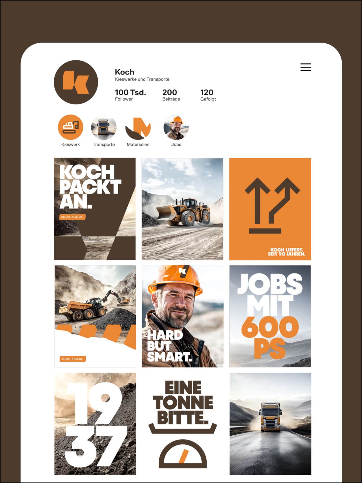 Die Bildwelt übernimmt eine entscheidende Rolle. Statt generischer Hochglanzoptik zeigen wir, was KOCH wirklich definiert: Maschinen in Bewegung, Menschen bei der Arbeit, Baustellenatmosphäre pur – staubig, roh, kraftvoll. Die Perspektiven sind nah dran, die echten Szenen zeigen Haltung und wecken Emotionen. Beim Wording dringt ebenfalls eine klare Mechanik durch, direkt, bodenbetoniert, ehrlich: kurze, prägnante Headlines mit Wiedererkennungswert. Aussagen wie „KOCH liefert“, „KOCH stemmt“, „KOCH schleppt“ bringen die Leistung des Unternehmens auf den Punkt.