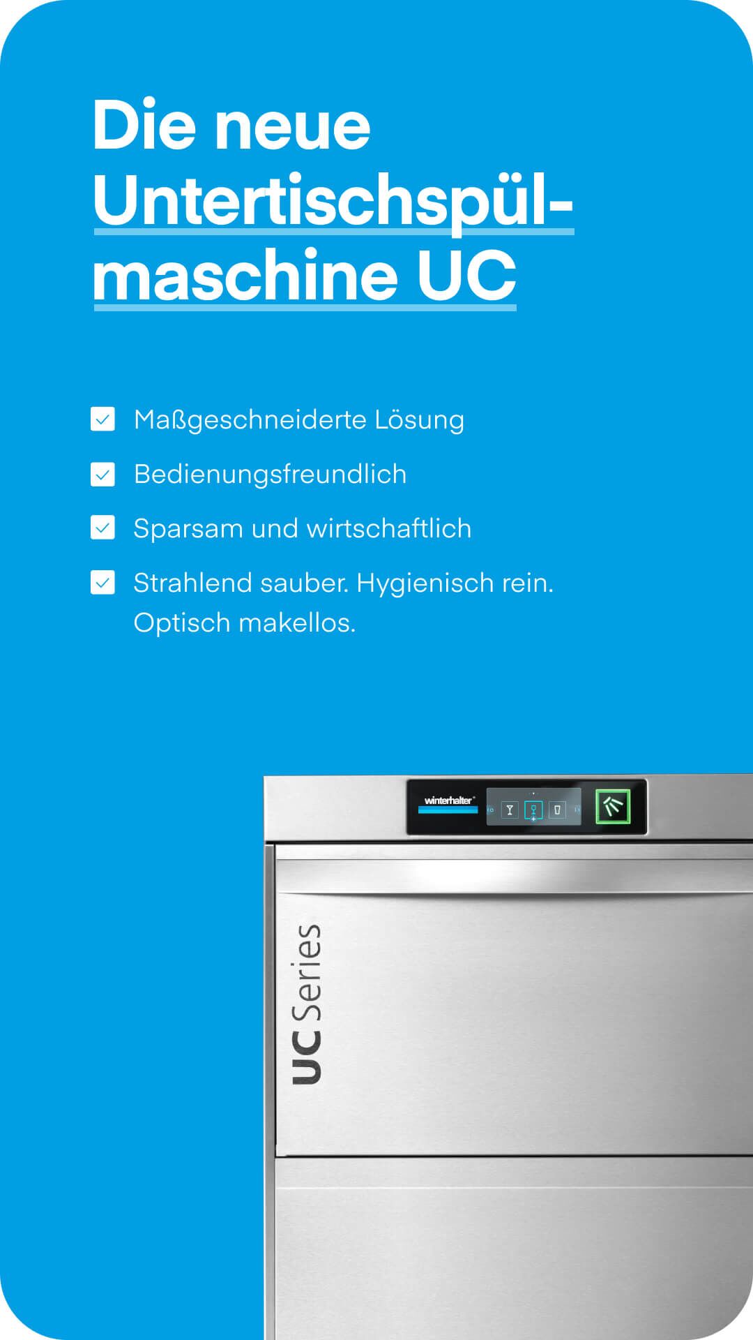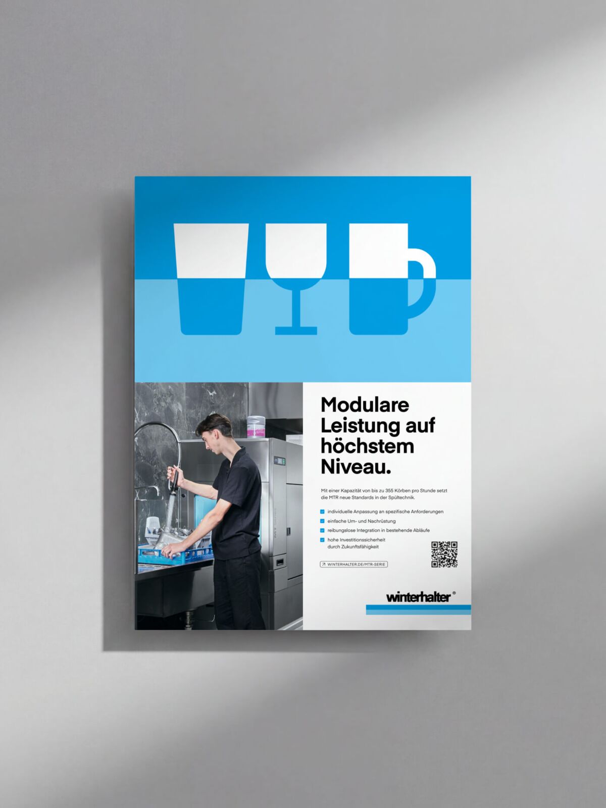 Hochburg hat dieses Fundament aufgenommen und scharf konturiert weiterentwickelt. Aus einer bewährten Designsprache wurde ein System, das die Qualität und technische Stärke von Winterhalter spürbar übersetzt. Das charakteristische Blau erhielt Tiefe und Leuchtkraft, die Stripes wurden zu einem verbindenden Element, das über alle Medien hinweg Orientierung und Bewegung schafft. In der Typografie verschmelzen Struktur und Wärme, ein klarer, reduzierter Copyfont trifft auf eine zweite, die den kommunikativen Ton veredelt und erdet.
