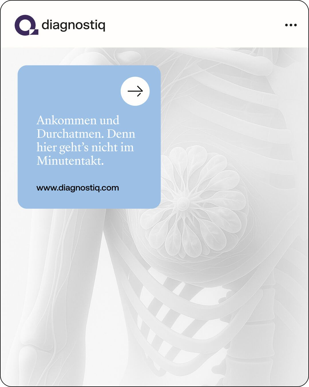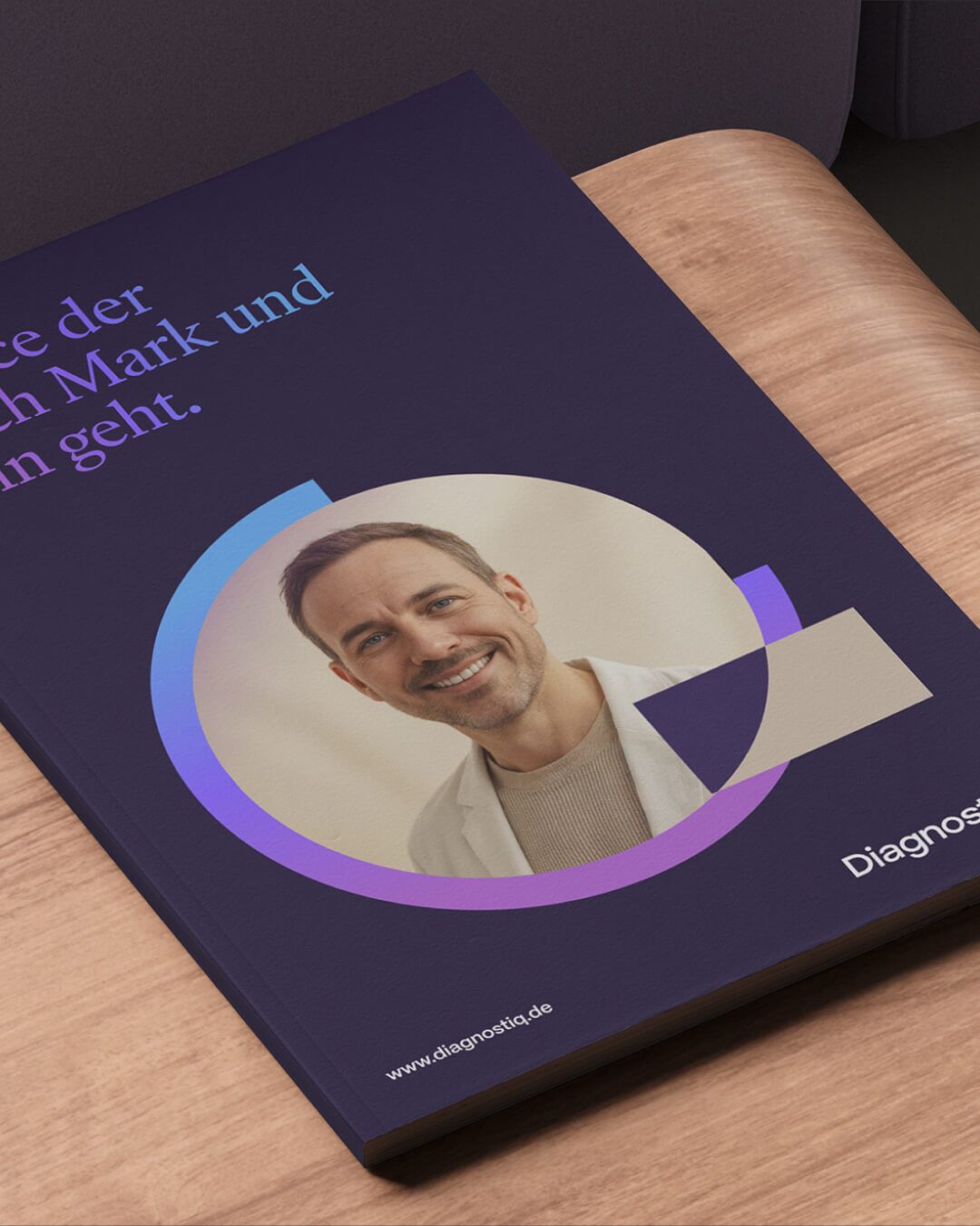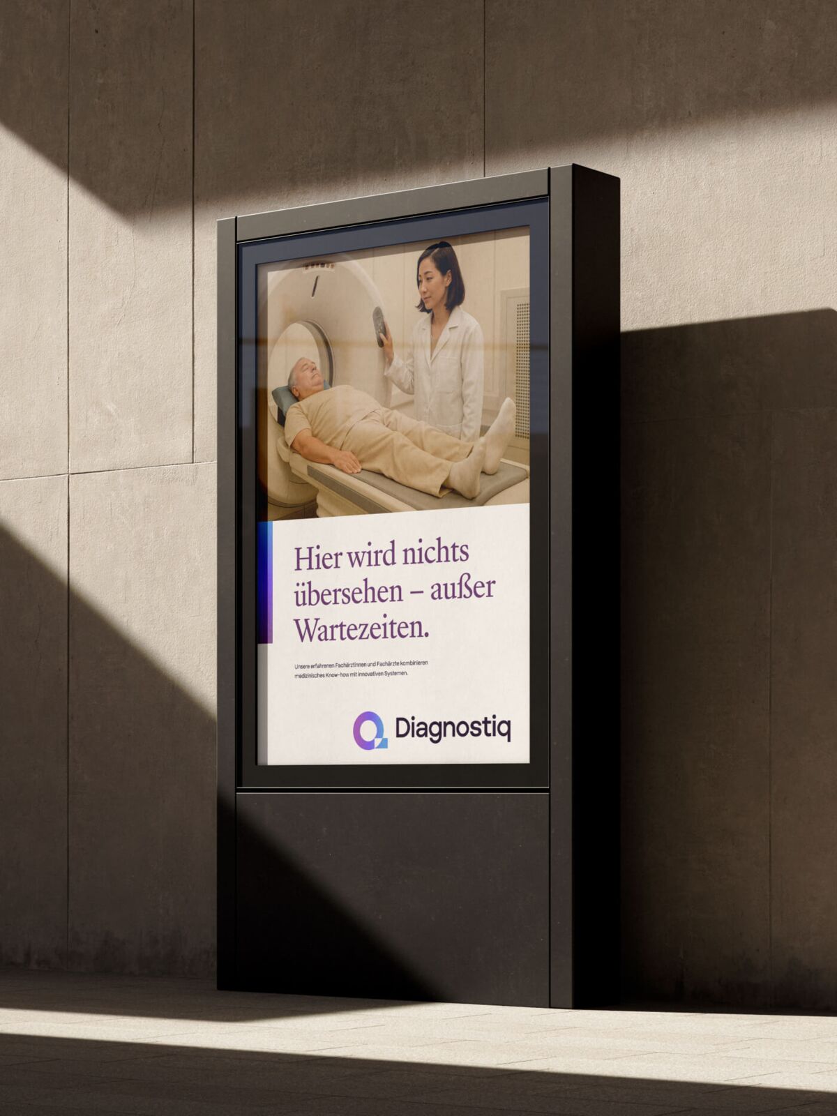 Alle kennen es, die schon mal im Wartezimmer ausgeharrt haben: Radiologie ist meist ein Raum der Distanz, geprägt von kühlen Geräten, nüchternen Wänden und einem Vokabular, das mehr verunsichert als Vertrauen schafft. Diagnostiq wollte genau hier ansetzen und eine neue Sprache finden, eine visuelle Identität, die Hightech-Medizin nicht als kaltes Instrument, sondern als verlässlichen Begleiter inszeniert. Im Fokus stehen Prävention und Diagnostik auf Augenhöhe – beides mit dem Ziel eines langen, gesunden Lebens.