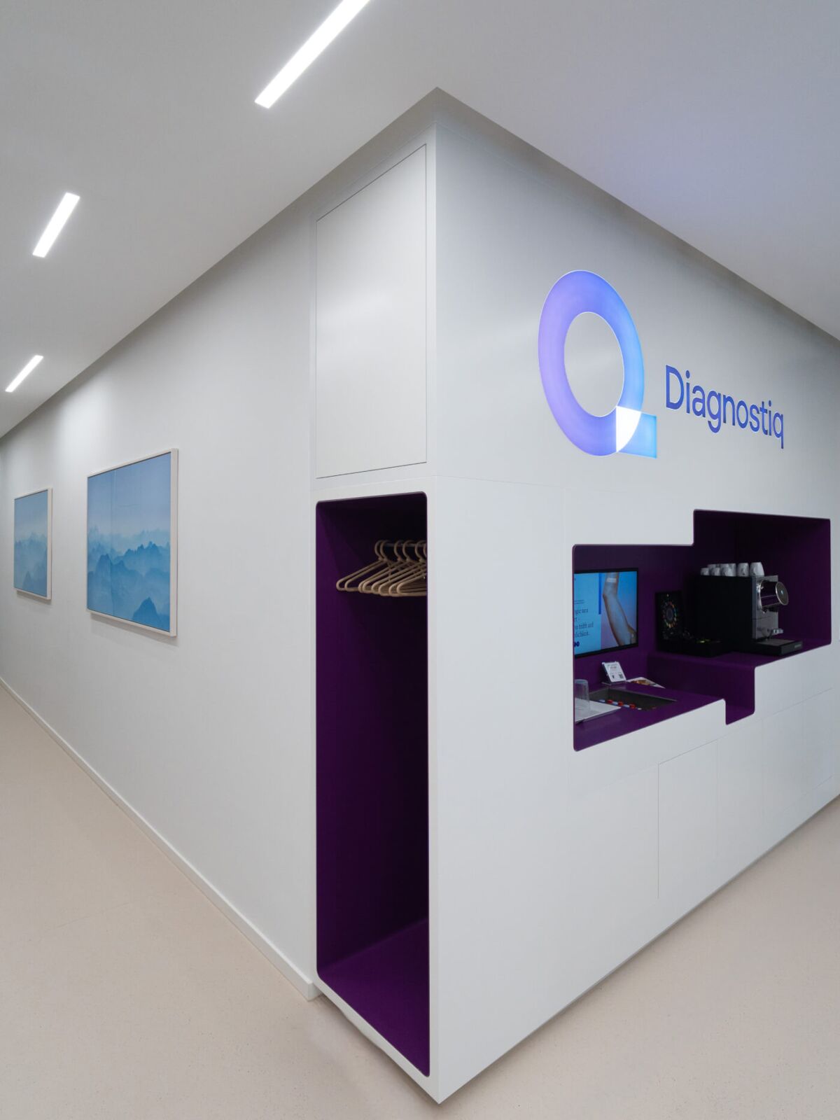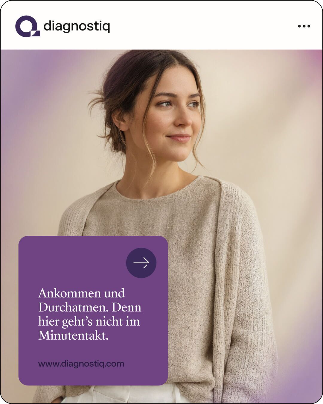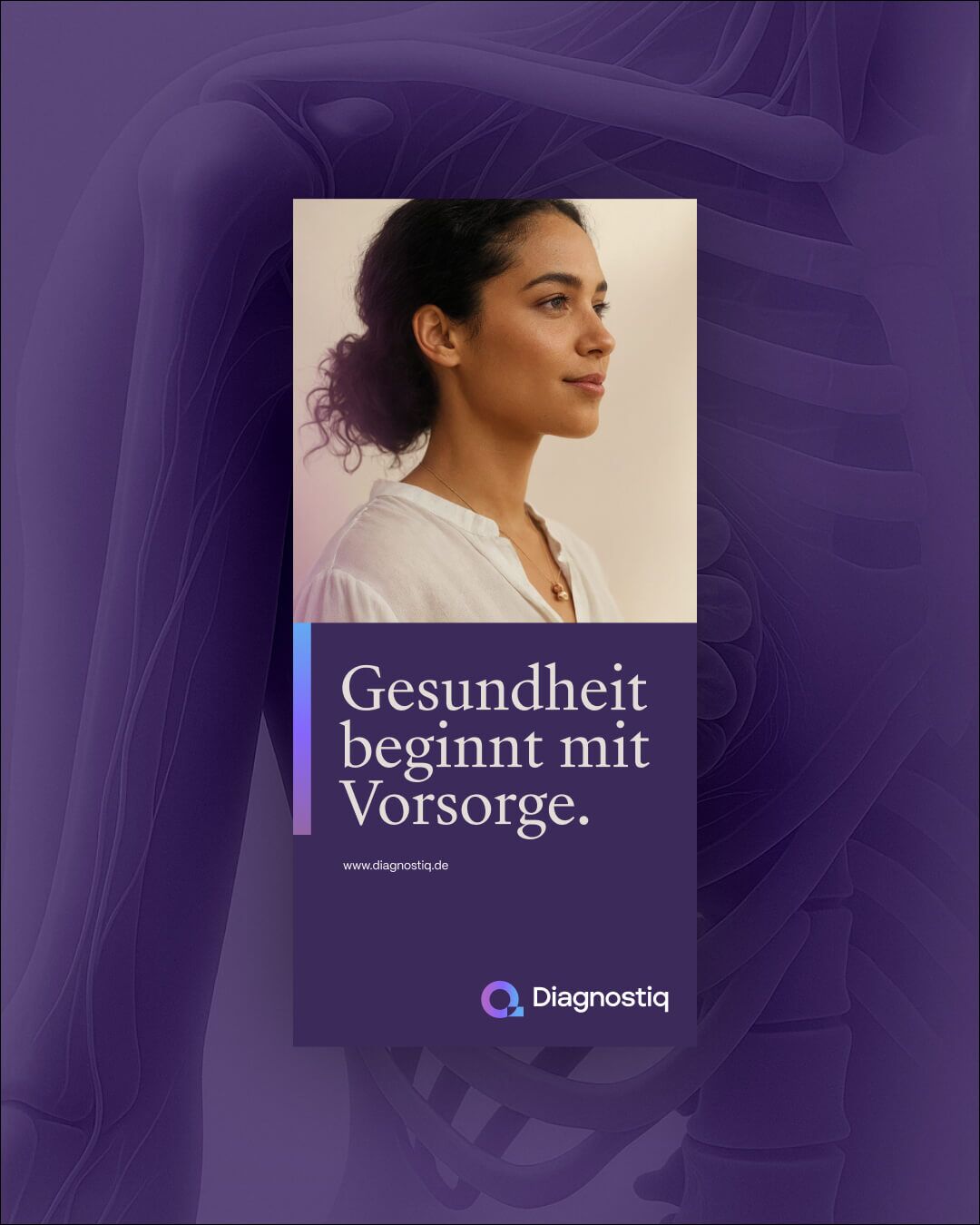 Alle kennen es, die schon mal im Wartezimmer ausgeharrt haben: Radiologie ist meist ein Raum der Distanz, geprägt von kühlen Geräten, nüchternen Wänden und einem Vokabular, das mehr verunsichert als Vertrauen schafft. Diagnostiq wollte genau hier ansetzen und eine neue Sprache finden, eine visuelle Identität, die Hightech-Medizin nicht als kaltes Instrument, sondern als verlässlichen Begleiter inszeniert. Im Fokus stehen Prävention und Diagnostik auf Augenhöhe – beides mit dem Ziel eines langen, gesunden Lebens.