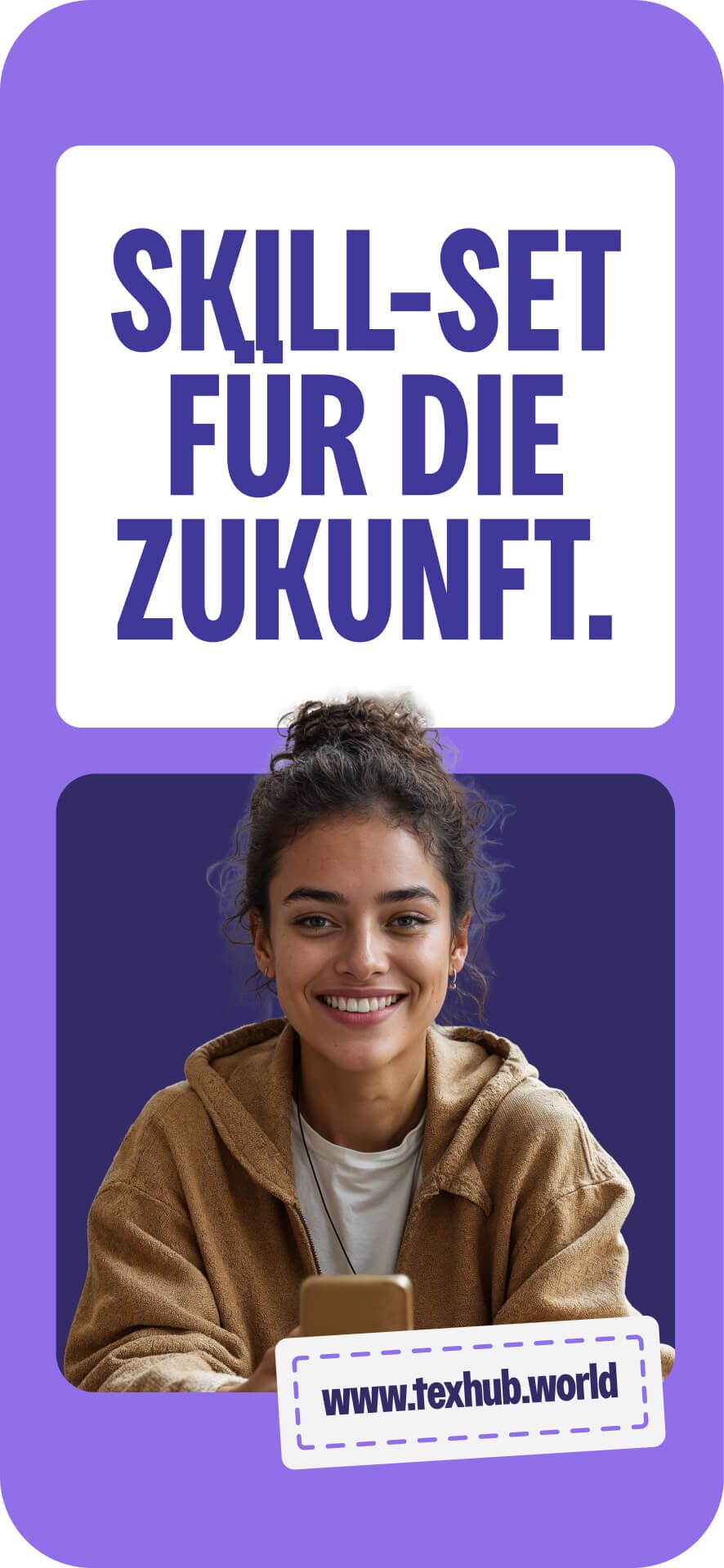 TEXHUB versteht sich als Schnittstelle zwischen Zukunftstechnologien, Bildung und Handwerk. Das Design greift diesen Anspruch auf und bietet auf eine starke erfrischende Wow-Art den Rahmen für eine Plattform, die richtig Bock auf textile Berufe macht. Wo können wir uns bewerben?