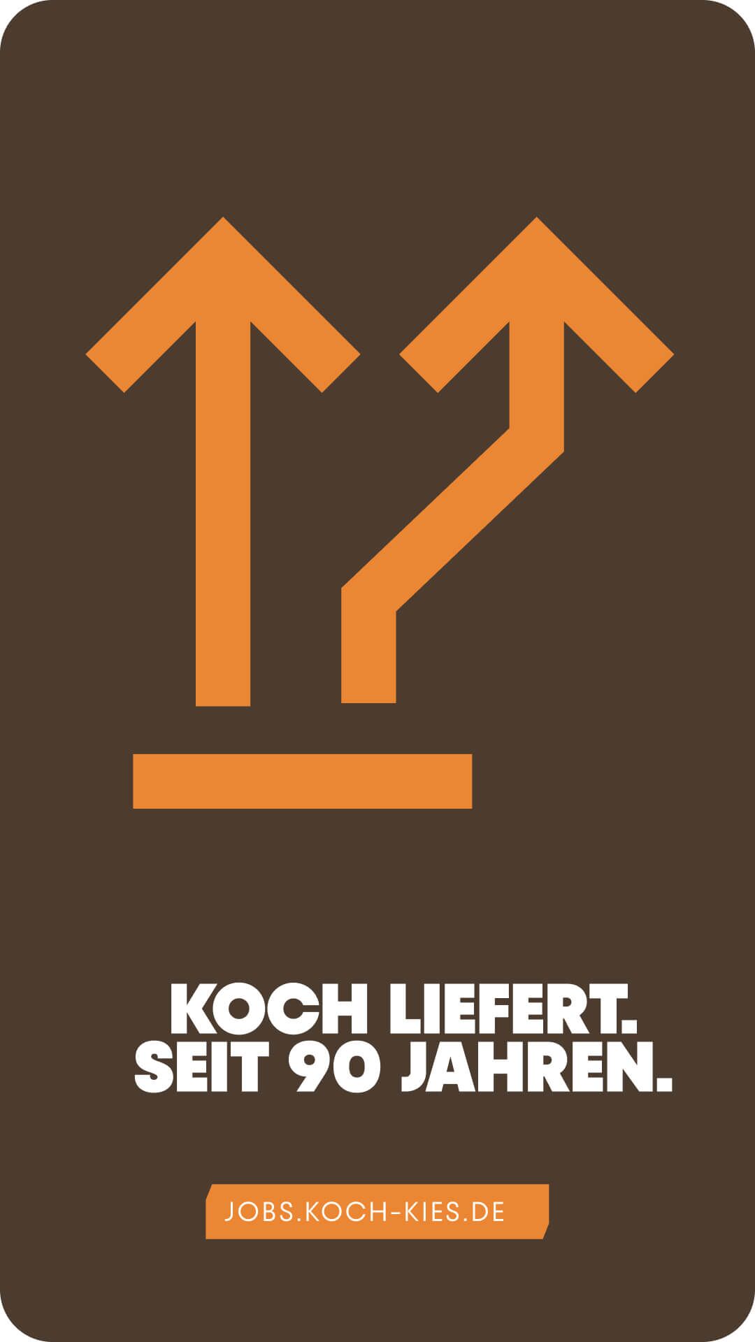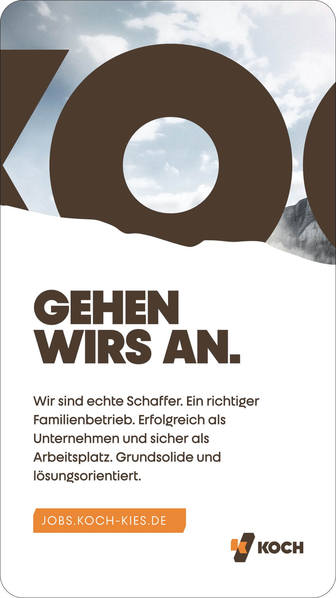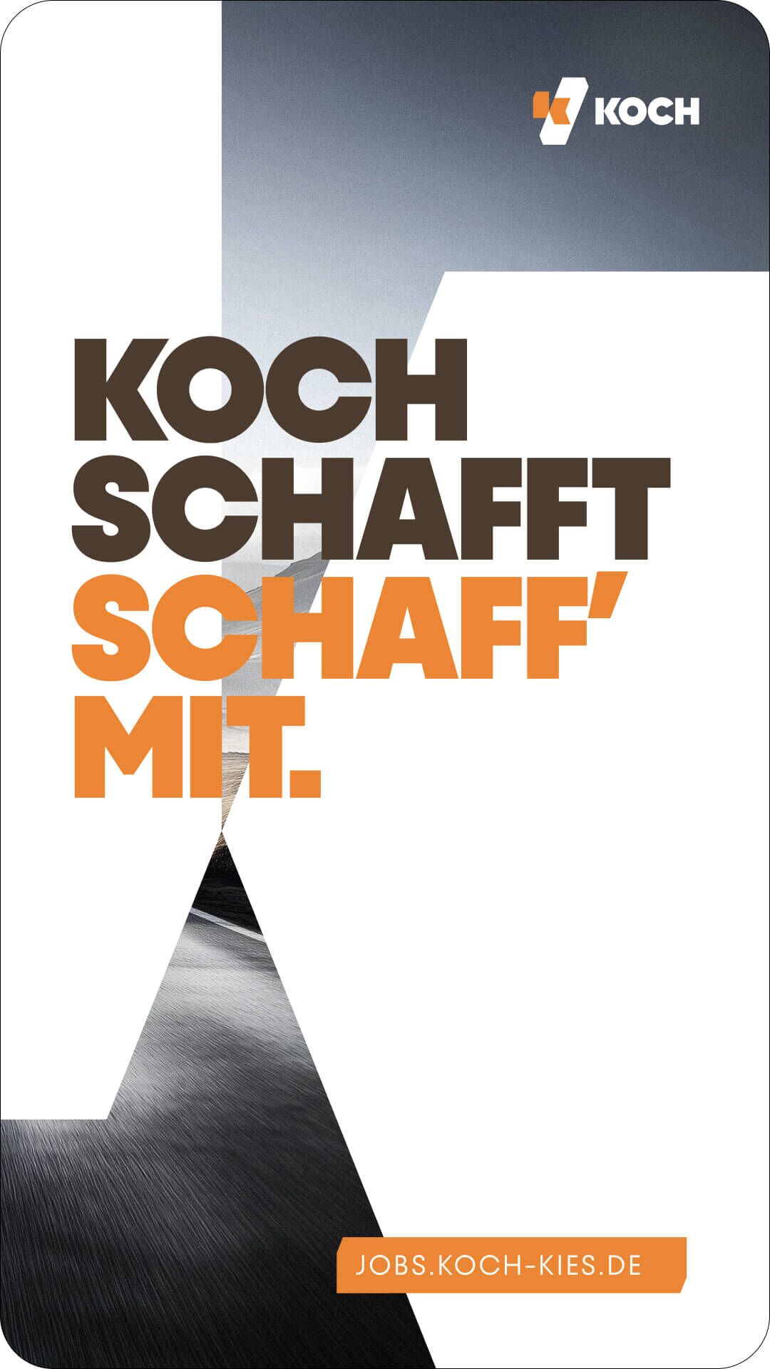 Ein weiteres zentrales Element des Corporate Designs ist die „Kieskante“. Die horizontale Fläche zieht sich wie ein visueller Sockel durch alle Layouts. Sie schafft Raum, strukturiert Inhalte und gibt dem Design ein markentypisches Gerüst. Zusammen mit dem Layoutsystem „KOCH Construct“, das klare Raster und starke Kontraste nutzt, ergibt sich eine visuelle Sprache, die flexibel, wiedererkennbar und medienübergreifend funktioniert.