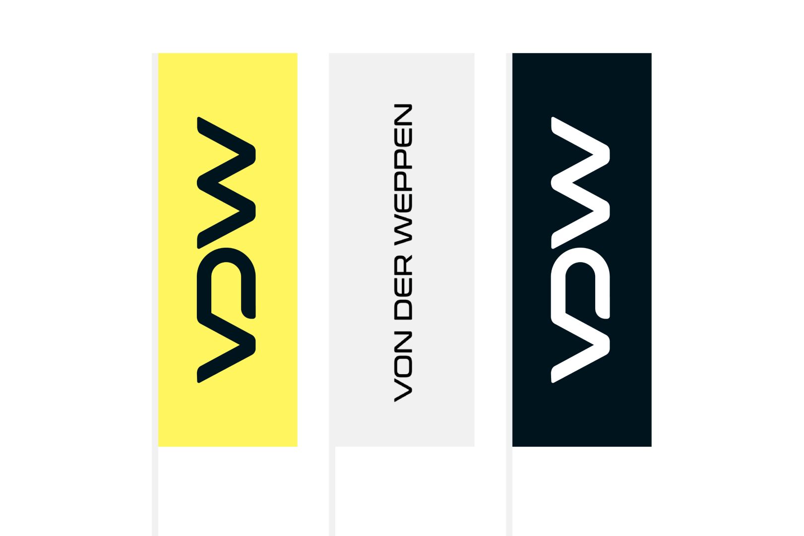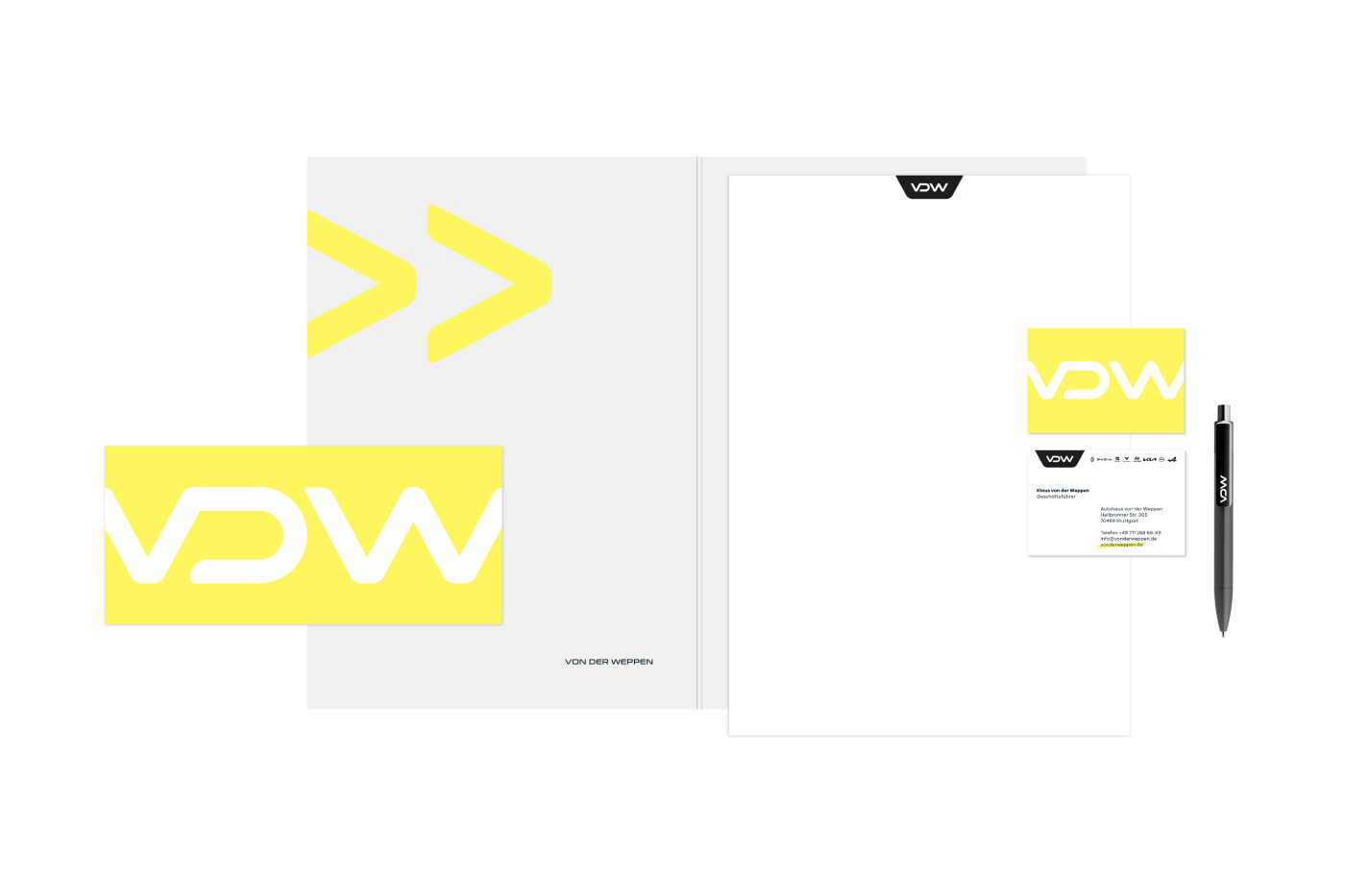 Ein etwas staubiger alter Schriftzug wurde bold und clean gezogen. VON DER WEPPEN. Geht mit dem Zusatz „Autohaus“ oder ohne und wirkt offensiv auf dem Nummernschild, dem Hauptkommunikationstool der Weppens. In Kurzform wird daraus das Signet und neues Logo VDW. Eingefasst in einem Notch analog eines Rückspiegels hebt es sich auf verschiedenen Medienträgern ab. Denn das war der grundlegende Hustle: Ein ausdrucksvolles Markendesign für eine Autohaus-Familie zu schaffen im Kontrast zu den vielen Automarken (ergo vielen Markendesigns), die man anbietet.